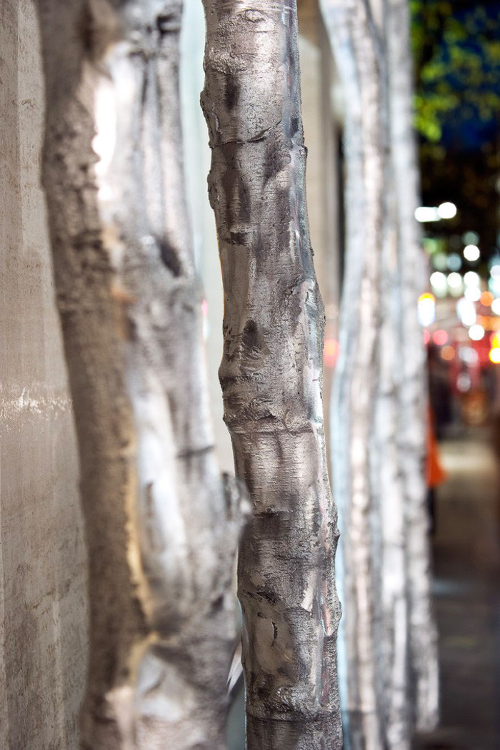 Eighteen of the shimmering cast silver trees were installed into the pavements of New Bond Street and Bruton Street, the axis of the Hermès boutique. The forest continues into the windows and through-out the ground floor of the store. Passers-by are able to explore the iridescent forest, to touch the wintry surface of the metal and feel the ‘bark’ etched with the patina of the silver birch...in the background the sound of birds and horses’ hooves galloping in the winter snow can be heard.